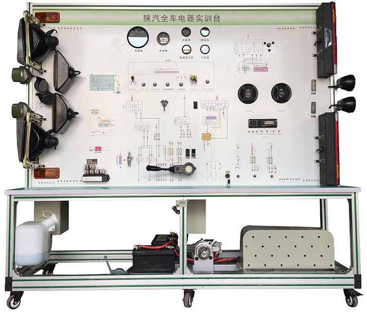 全車電器電路實訓(xùn)設(shè)備采用陜汽SX2220柴油機(jī)整車電器實物為基礎(chǔ),充分展示汽車儀表系統(tǒng)、燈光系統(tǒng)、雨刮系統(tǒng)、喇叭系統(tǒng)、發(fā)動機(jī)電器系統(tǒng)、起動系統(tǒng)和充電系統(tǒng)等汽車電器各系統(tǒng)的組成結(jié)構(gòu)和工作過程。